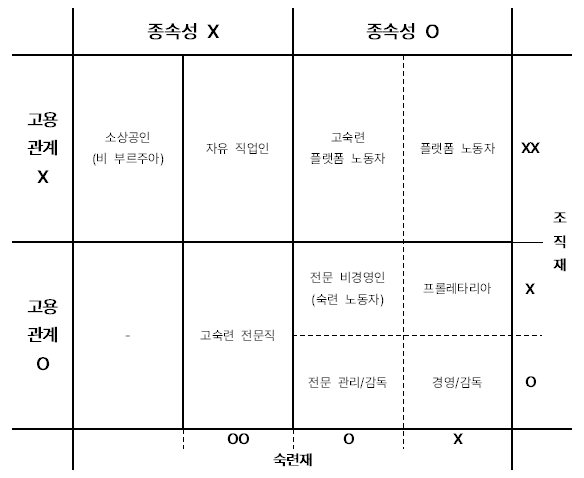 | 고용관계 X | 보통의 자영업자 | 종속적 자영업자 |
